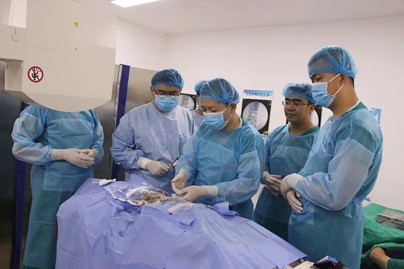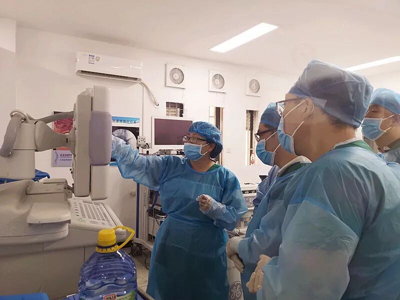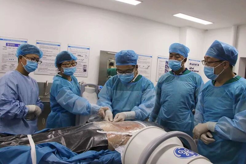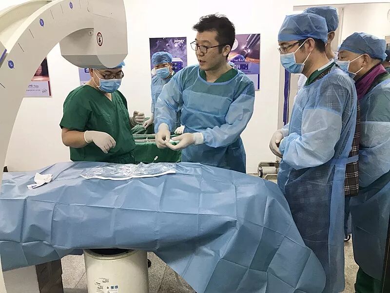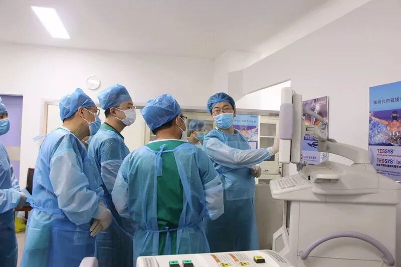 在培训现场,2 台 C 臂、铅衣、2 套 TESSYS Isee 和 Delta 手术器械,设备准备完善,每组四人轮流在实体标本上进行操作,完全模拟手术操作,每个学员都有充足的动手操作机会,使他们掌握穿刺技术、定位及镜下基本操作。