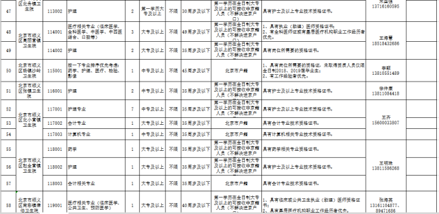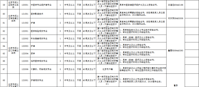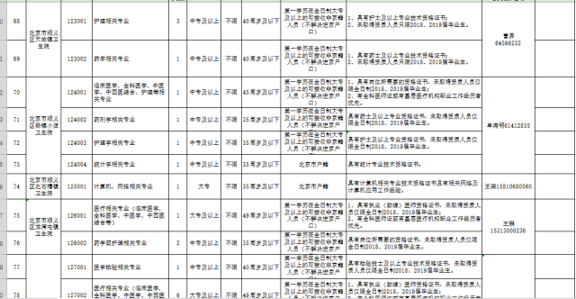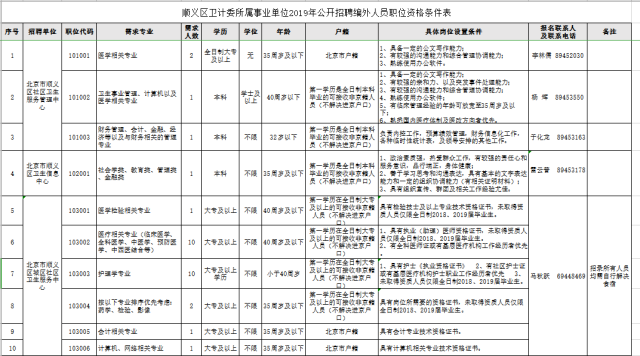 顺义区卫计委所属 29 家事业单位,分别招聘医学相关专业技术岗位及辅助管理岗位共计 183 人。详情见《顺义区卫计委所属事业单位 2019 年公开招聘编外人员职位资格条件表》。(见下图)