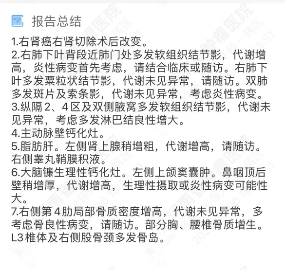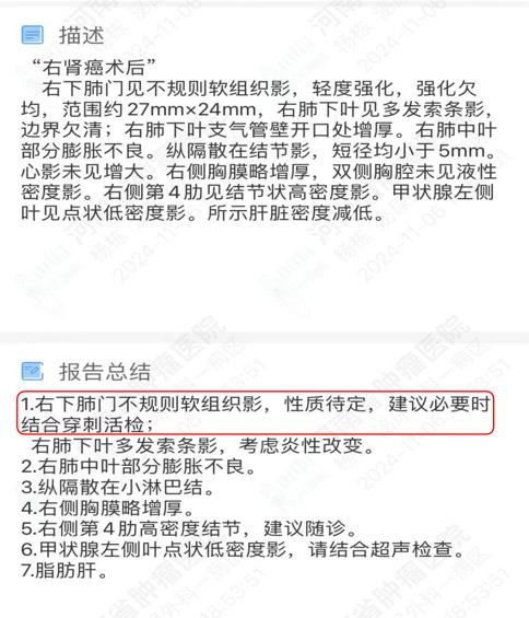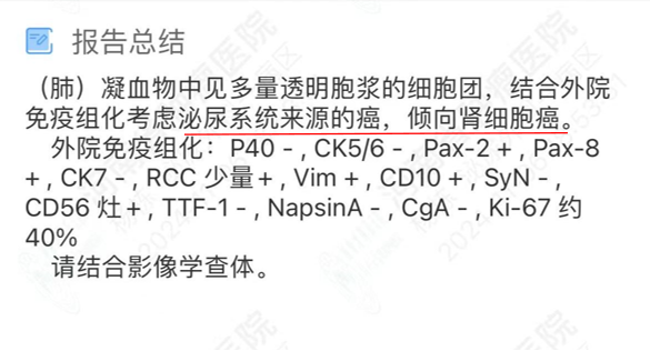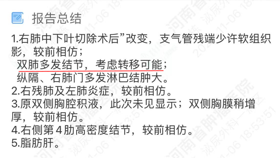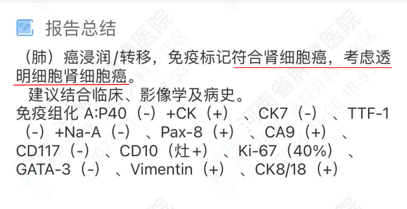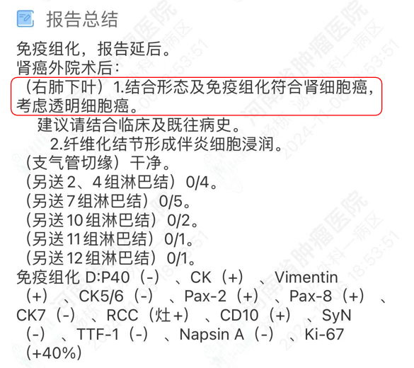 现病史:患者于 15 年前因体检发现右肾肿瘤至外院就诊,完善检查后行「右肾切除术」,术后病理提示肿瘤,具体不详,术后未予治疗。4 年前咳嗽至郑州市人民医院检查,CT 示:右肺下叶团片状不规则高密度影,行活检提示:肺转移肾透明细胞癌。遂至我院胸外科就诊,完善检查后行胸腔镜下右肺中下叶切除术,术后病理:符合肾透明细胞癌肺转移,术后给予患者口服 「舒尼替尼」治疗半年后因不良反应自行停药。