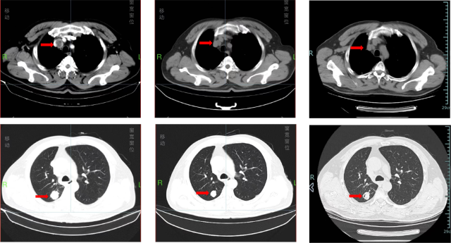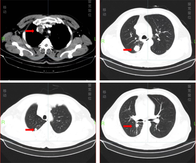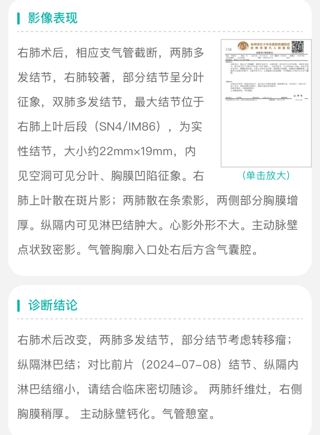 2024 年 7 月,再次至该院复查 CT 提示双肺多发结节(最大径 2.3cm),较前明显增大,部分考虑转移,纵膈淋巴结肿大,考虑转移。
