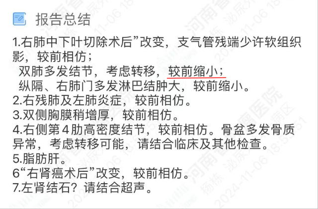 现病史:(续)2023 年 6 月患者至杭州市第九人民医院复查 CT 提示双肺结节(最大径 14mm),考虑转移,并给予「阿昔替尼」疗;2024 年 7 月,再次至该院复查 CT 提示双肺多发结节(最大径 2.3cm),较前明显增大,部分考虑转移,纵膈淋巴结肿大,考虑转移。今患者为进一步治疗来我院就诊,以「右肾肿瘤术后肺转移」收入我科。