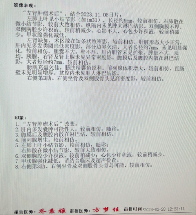CT(2023.7.17):1. 左肾上腺结节、左肾结节及肿块较前明显增大:转移?左肾 CA 并左肾内、肾上腺转移?2. 腹膜后淋巴结较前增大,转移可能;3. 余况基本同前。
