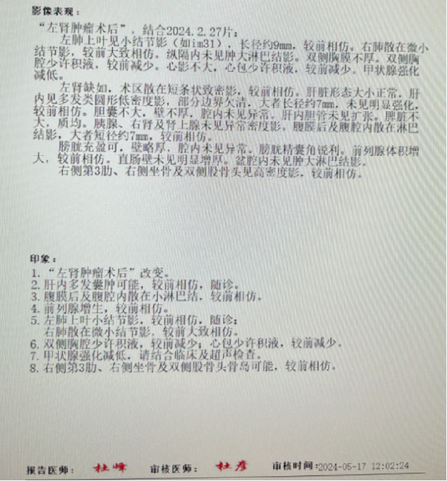 CT( 2024.4.26 ):1. 左肾 NSS 术后改变,左肾新见多发结节状等密度灶,考虑复发;2. 右输尿管上段结石消失,右肾积水缓解,右肾萎缩;3. 余况同前。